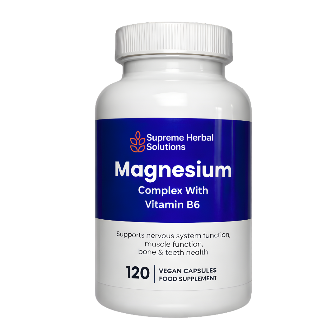 Magnesium Complex with Vitamin B6 combines three bioavailable forms of magnesium to support muscle function, nervous system health, and energy metabolism. Vitamin B6 helps reduce tiredness and fatigue for daily wellbeing.